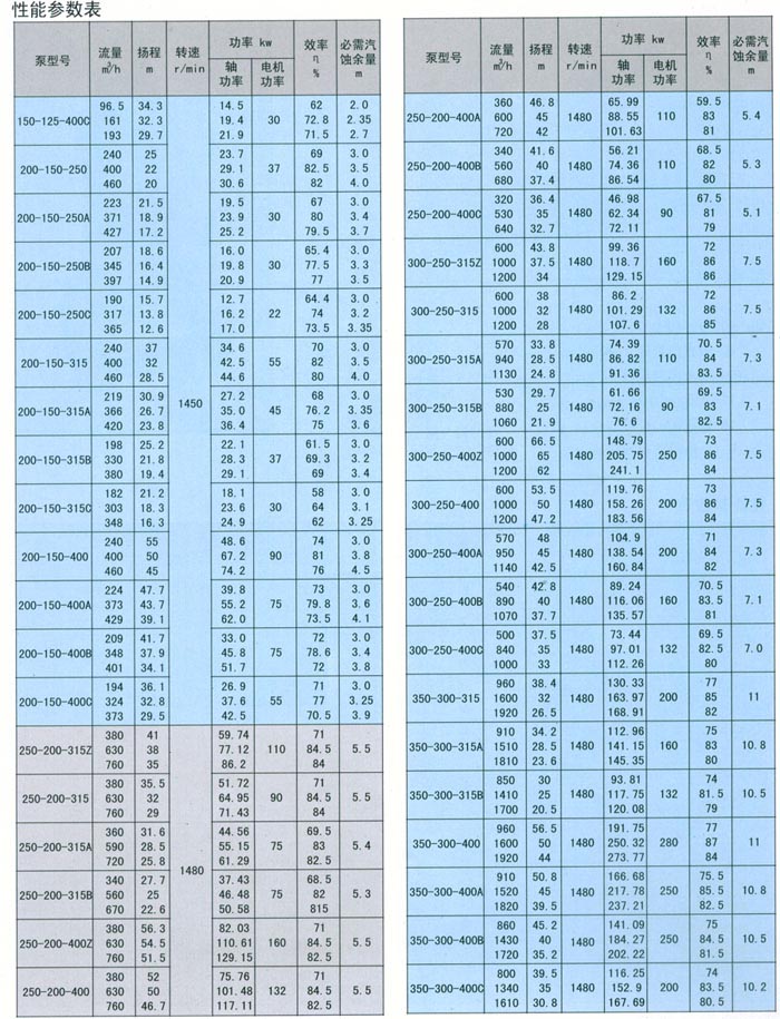 该型号泵的流量从100m%h至1920m%h扬程从20. 5m至125m。该型泵的工作温度为一10'C至80'C;泵的进口压力可达1.5MPa (15kg/cm)